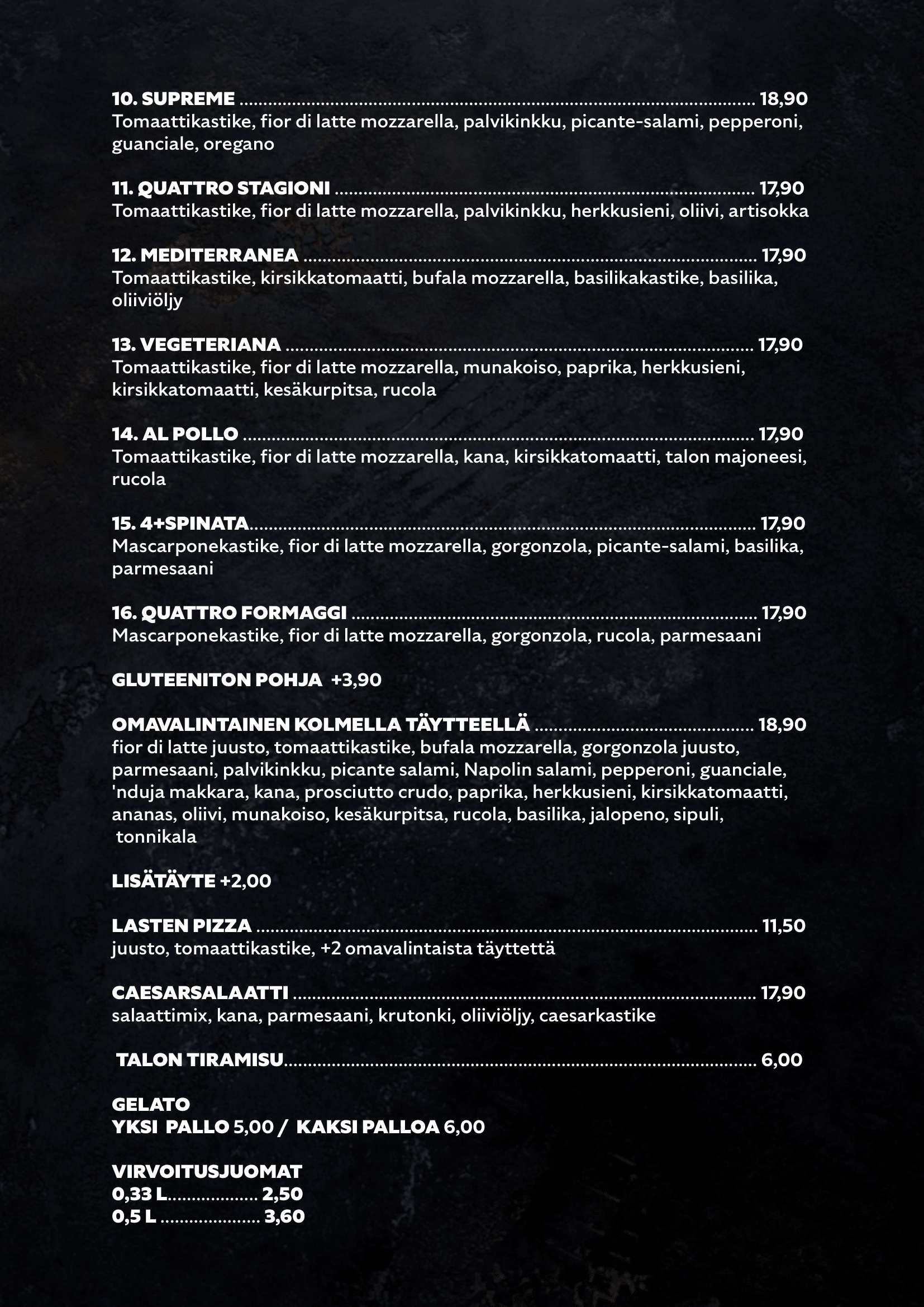 Tutustu monipuoliseen menuumme, joka sisältää ainutlaatuisia italialaisia pizzoja. Aina ajattomasta Margharetasta erikoispizzojemme rohkeisiin makuyhdistelmiin, meiltä löydät uudet ja vanhat suosikkimakusi. Pizzamme valmistetaan alusta asti käsityönä, aidoista italialaisista raaka-aineista. Testaa myös valikoimamme raikkaat salaatit!